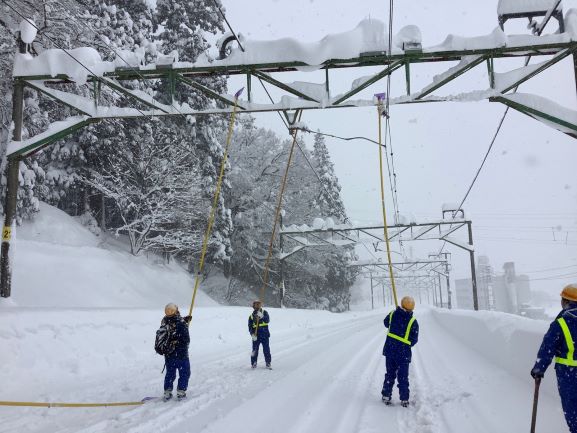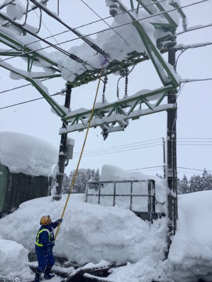 架線に溜まった雪を落とす様子も